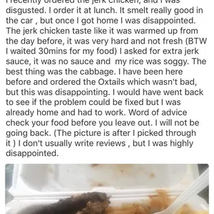 I wish I could give this 0 stars. This has to be the worse Jamaican food I have ever eaten. Paid $13 for large curry chicken. 3 chunks of chicken breast with no flavor. I have never seen curry chicken with no color... look at the photo! This stuff was pale and tasted as such. Rice was super gummy with no taste of coconut. Cabbage was bland and plantains slimy. I should've just went to my regular spot but wanted to try somewhere new. Never again. Save your coins. The curry chicken I cook at home is at least 5x better than this mess.