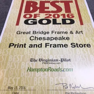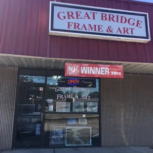 If you need an honest, trustworthy, competent, and kind frame/art vendor, visit David at Great Bridge. He's been operating there for over 40 years! Wanted to frame a sentimental, one of a kind banner as a gift for my boss. Because of the complexity, whoever did the work needed to be trustworthy and competent. Co-worker and I decided to support local and try GB F&A from reputation (several "Best of" awards) and proximity to our office. David, shop owner, was patient, professional and helpful, showing various types of frame options (black, brown, brown with black, beveled, beaded, inlayed, etc) as well as various mat options/colors. Never tried to up-sell or offer us something we didn't need/want.We opted for a classic brown with black wood frame without a mat; since the banner was bright orange, having the finished mitred frame with cover glass look would fit into any business/home office motif. After taking a few measurements, David quoted us a price of $85. He took my phone number, we imitated shaking hands (COVID life), and he promised it would be ready in about a week. Sure enough, I got a text 1 week later saying it was ready. Finished product turned out better than imagined. Best of all, David said "it came out to be under what I quoted, $75 please." Paid via credit card quickly and easily, thanked David, and we were on our way.