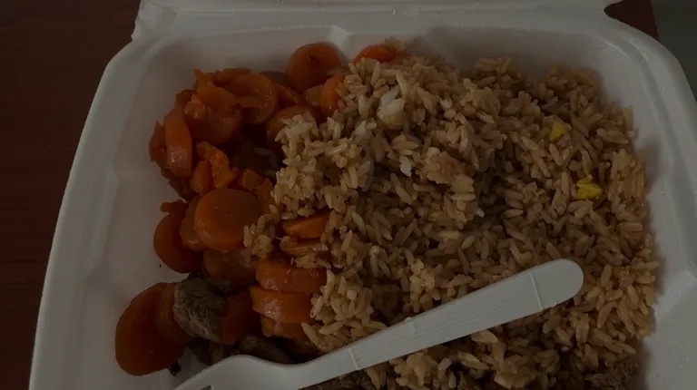rice and carrots in a styrofoam container