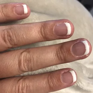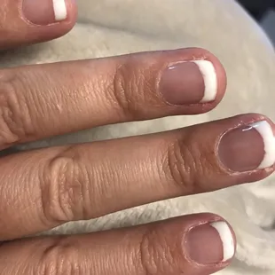 I'm very disappointed. I asked for short nails, no gel, regular nail polish. I got my nails done two days ago. It looks messy.
