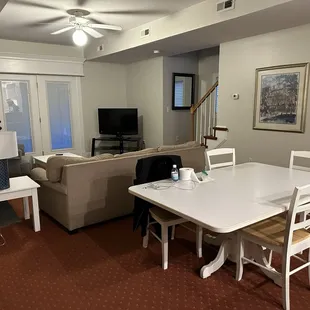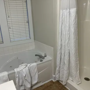 Breathtaking absolutely stunning. We got one large unit with two bedrooms, two bath and a pullout sofa, huge kitchen, huge living room, eating area the bedrooms are big the bathrooms are big everything was beautiful, clean and modern. It had an attached apartment like an Inlaw apartment for my elderly mom so she had a walk in. She also had a Jacuzzi a huge bedroom. She had to pull out a little eating area and a mini kitchen they we were all decks around the people were wonderful they were activities, and of course, for us so much to see in colonial WilliamsburgBoth units had stacked washer and dryers that worked perfectly