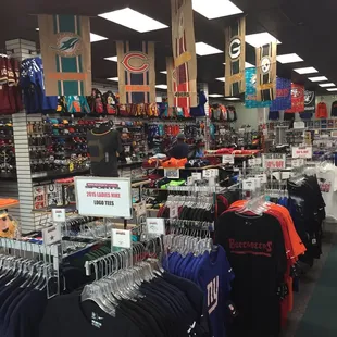 I'm not quite sure what is going on at this place. The guy working said they've only been open for a month but my memory serves as this spot being a sports store for athletic team shirts, jerseys, glasses, bags, etc.Of course, I have to support my 49ers so I popped in yesterday and picked up a throw blanket, hat and t-shirt. There was only one guy working but he was so helpful to everyone there. I said that I'm a 49er fan and he went through the trouble of showing me all that he had. I was ready to drop a bunch of money because this guy was so helpful. I'm certain to be back to pick up a few more items. Total spent was around $100 and I was pleased.This place is inside the mall. Enter through Dick's Sporting Goods or Dave and Buster's. :)