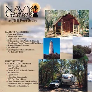 Navy Getaways on Fort Story is great! You can rent campsites, RV sites, stationary campers, camping cabins, bungalows, and log cabins. All sites are equipped with water, electricity, fire pits, and picnic tables. Sewage hook-ups are not included, however, there is a dump station located in the parking lot that is available for use at no charge. Additionally, there is a large area located in the center of the campground for patrons to gather and enjoy a bonfire or cookout. You can reserve at their office on base, online, or by calling 1-877-NAVY-BED. We have camped here, but we really enjoyed renting out one of the 3 bedroom log cabins. It had a full kitchen, bathroom, and linens provided. Ours had a fireplace, but I was told only a few have the fireplaces. There is a nice swing on the front porch and a fire pit nearby. You can walk to the playground or to the beach. Great little getaway! I noticed that they also rent kayaks, beach equipment, and more at their office.