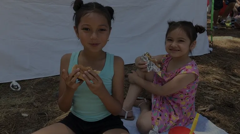 two young girls eating a sandwich