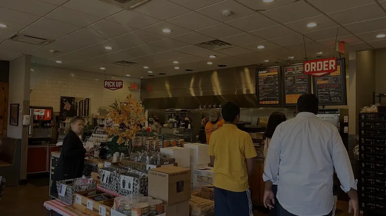 Restaurant interior with menu and food trays