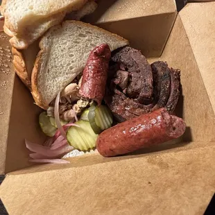 3 protein meal. Sliced brisket, sausage and pulled chicken. Baked beans, Smoked Mac n Cheese, coleslaw. Bread and pickled veggies.