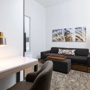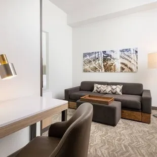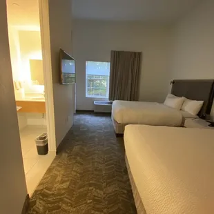 A four and a half star only because the roll in shower set up left water all over the floor. Haha even with the curtain and the extra drain on the floor. Maybe we are just sloppy shower takers. I had booked a handicap accessible room due to my current hopefully "temporary" mobility issues requiring use of adaptive equipment and weight bearing restrictions. Thankfully I was prepared in case the roll in shower didn't have a built in seat, which it did not. I brought along a portable shower chair to use. They did have the handheld shower and two grab bars. I do wish they had placed the shampoo and soap dispensers near the faucet and not at the back of the shower, so that it was more accessible when sitting on the shower chair. The room was large and spacious as most of the Springhill suites are. They had a mini fridge, microwave and sink. The bathroom was of course spacious. Plenty of lighting and a huge sized pull out sofa and twin queen beds. The room was renovated and had blackout curtains. I was able to store my knee scooter and walker and crutches in the room with plenty of room for the other two people with me to move freely around without hazard.Breakfast was included 6:30am-9:30am which included a good selection of PRE packaged foods- including PRE packaged orange juice, apple juice and cranberry juice, milk and bottled water with signs to please take only one of each and a paper bags to carry with you if you choose or an option to sit down at the tables. Other breakfast items all PRE packaged included chocolate, and blueberry muffins, granola-ish bars, 2 hard boiled eggs in a package, instant cup oatmeal- apple cinnamon or maple brown syrup, bananas, oranges or apples. They did have a small hot to go section where you had to use gloves when serving yourself which included scrambled eggs , turkey sausage and bacon with containers to place them in. They also provide coffee and tea. The front desk people were kind and friendly and we were able to do early check in around 1pm. Because I am a Marriott Elite member they provided me with a bottle of water and two snacks(packaged cookies and planter's nuts and chocolate and wipes at check in. This is a nice clean and updated hotel within proximity to lots of restaurants and other hotels! Food for thought you can actually walk to, there's an ice cream shop within walking distance, McDonald's super close, you can walk to Ripley's believe it or not. CVS isn't too far a drive either. It's very conveniently located to Green Springs Interpretative trails, LeYaca and the movie tavern as well. You get the point ! ;-) They have an indoor pool which we didn't utilize and a 24 hour indoor gym. Plenty of parking! Highly recommend! Ps I checked in on Yelp and you get a free beverage from the market. Oh and they do have hair dryers!