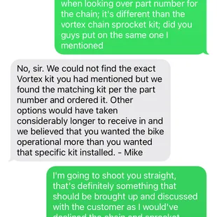 the service techs are probably the best part of the whole service area. I took my bike in for a recall, rear tire replacement that had a nail in it, and a post purchase inspection as the bike was since recovered from a theft and was being brought back into the road. Mike Kilbride in the service department asked if I wanted to repair and tire that should've been my first sign.. I looked past it Mike seemed to be pretty good at first was decent with communication and then completely left me hanging. The service techs had a chance to find everything needing replacement and wether or not they were critical; one of those happened to be a chain and was reccomended to change the chain and sprockets I thought why not. I spoke with Mike asking if we can put the same vortex chain and sprocket kit on it that was previously on the bike; no problem they don't have In stock; but can definitely order it. a week later when I got the write up and I had a chance to review that the part numbers were not the same for what I requested for the chain and sprocket kit. Mike stated that they believed I wanted my bike operational more than I wanted that specific kit. as I work in the service industry if I ever told a customer this is what they are getting and then make my own conscious decision to give the customer something else is so unprofessional. at the very least a phone call saying hey the specific kit you want will take significantly longer here's what we recommend and why. at the end of the day I did my research to find out that it was indeed a good kit to put on but as a service person whose expertise is in motorcycles it would've been professional to advise the customer and let them make that decision. my only other complaint is that my passing and brights were working before and now they're not?? now I got to sit down with a volt meter on my day off to diagnose and fix.otherwise the work done was superb from Logan the service techand one other guy in service who I spoke with on pickup if it wasn't for them this would be a one star review.