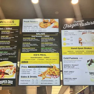 I love super chix! The food is always fresh (which means yes, sometimes there is a bit of a wait.) i love the buffalo chicken salad, as well as the chicken sandwich. The fries are also amazing and they have an assortment of seasonings you can choose from. They also have ample sauces for your fries, tenders, etc. all of the employees are very nice and welcoming. I don't think I've had a bad experience with any of them. The restaurant itself is a nice size, with the option to dine in or take out.