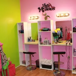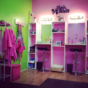 I wanted to love this place, I really did. I had this great plan of including it in a reward system for my now 4 year old daughter. I walked by it all the time and finally decided "What is a better time to try it out than to get her and some of her little friends dolled up before a birthday tea party?!"I walked in for my first encounter with them. The receptionist was very stand offish and not very welcoming of any of my questions. Apparently the "original" price of the tot make over is $35 at least it is when it comes to the (only cash) gratuity that you have to pay. It's been advertised as $17 in the window for the last two years that I've been walking by there. My second encounter: I left but I had a couple more questions (since she made me feel super awkward and wasn't forth coming with any party info) so I called and nobody answered, I called a couple days later still no answer so I walked up there and they were with other customers OK I can see why they didn't answer. I give her my reservation thinking I have to pay a deposit but she doesn't mention it so we get there for our kiddie makeovers and I'm told I have to pay this forced gratuity upfront and in cash. I have to then leave my little girls first salon makeover birthday party because this girl "Oops" forgot to tell me. I leave and there are two attendants doing toenails for the four girls. I get back and there is one doing hair and makeup, the other one is one the phone or slumped over on the computer while the other 4 year olds are bored waiting. (Funny how there were other guests there twice before and they couldn't answer the phone when I called but here she is, on the phone) So I just help keep the girls happy and not show my annoyance because that's not going to help anything. At the end I'm saying thank you and whatnot and they aren't even making eye contact! Not doing that again.