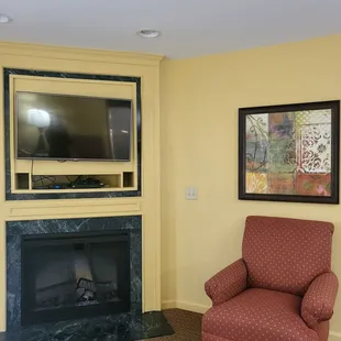 Sitting room, fireplace, tv, dining table, kitchen, hallway.