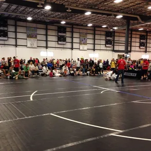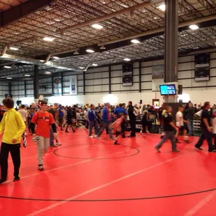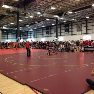 This an impressive multi-purpose recreation and league sports epicenter for all ages with plenty of free parking. On the left of the main entrance desk lies 4 indoor turf fields for soccer, flag football or nerf battles; to the right are 8 simultaneous regulation volleyball games or 4 full court basketball games or any combination of the two. There are metal bleachers for spectators on every court.Restrooms are in the middle of the building; a CHKD athletic trainer sits behind that section followed by a snack bar and seating area with 3 catv projection screens. Upstairs, there's a pretty cool kids play area with slides, another turf field, restrooms and stadium views of the entire facility. They even have outdoor sand courts.For us, refs have been hit and miss, not helped by 2 inoperable scoreboards, but acceptable for this level of play. While I lust over having a facility like this closer to home, there's a definite LACK OF SECURITY. Maybe they have cameras (?) but no visible force or even scrutiny upon people entering or exiting. This is of extreme concern especially considering the amount of children present.