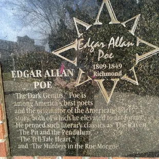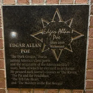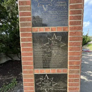 When you have nothing else to do. On a paved walkway, Brick pillars commemorating people who lived in Virginia. Like a local Hollywood Walk of Fame. Edgar Allen Poe, Thomas Jefferson, James Madison and...Katie Couric. New names added annually. They could have made it a bit nicer to show some pride. It just comes off as very bricky. The names are printed very small and difficult to read.
