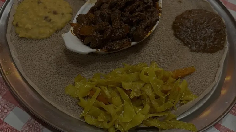 If you're looking for a satisfying, flavorful meal before catching a show at DC9 (or anywhere in the area), Axum is *the* place to go. We were looking for something quick but delicious, and this spot delivered in every way. I ordered the four veggie combo along with the spicy juicy beef, and it was more than enough food for two hungry people. The split peas and split lentils were both spiced perfectly, offering a nice balance of flavor without being too heavy. The collard greens were silky and cooked just right -- not overdone, which is often a challenge! The cabbage and carrots were also spot on, adding a great balance to the dish. The spicy juicy beef was definitely a highlight -- it was flavorful and tender, and while it had a nice kick, it wasn't overwhelming. The portion was generous, so we felt totally satisfied. The service was quick, and our waitress was super helpful. She gave us great suggestions on portion sizes and helped us balance our plate, which was much appreciated. I also couldn't resist trying the lentil samosas, and they were fantastic! Super fresh, crispy on the outside, and perfectly seasoned on the inside. Definitely worth the extra order. Whether you're heading to the 930 Club or another spot along the strip, Axum is a perfect pre-concert dinner choice. But honestly, it's worth going out of your way to try this delicious Ethiopian food.