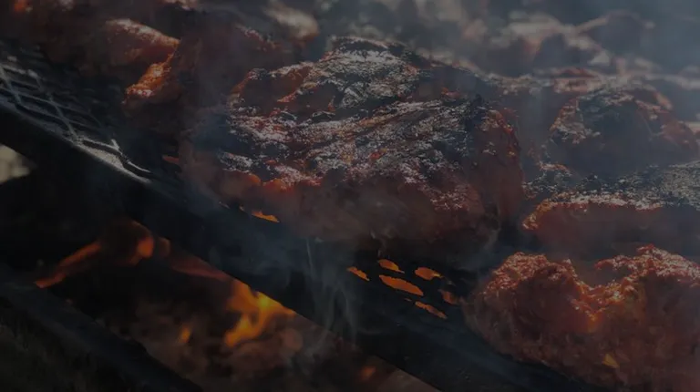 a bbq with meat and vegetables on the grill