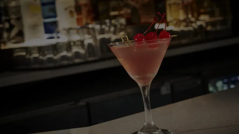 two glasses of wine on a bar