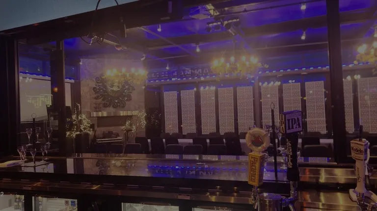 the inside of a restaurant with blue lighting