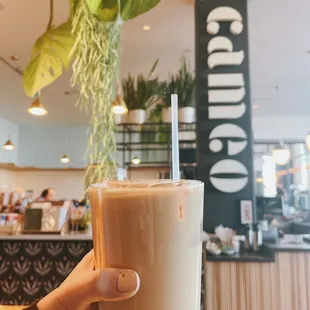 new coffee shop off the bucket list! - never been to the roost before and was very impressed by how lovely this food hall was, very clean and organized despite the many different options- abundant seating all throughout the hall with QR codes to order food to you! definitely a great place for remote work during day and meeting friends out later - cameo has a cool vibe, the workers were very friendly and the man who took my order had the best outfit HA - the pastries looked stunning and they have house made strips- my americano was okay, it had very little ice in it that melted before I left the place....flavor was good but considering an americano is already 80% water I was bummed when my 3 ice cubes were gone-zo