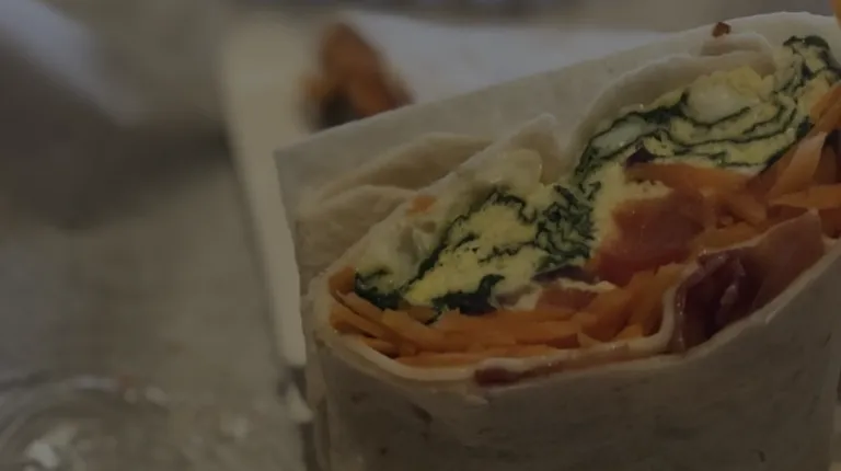 Omelet Wrap - eggs, ham, tomato, carrots, spinach, swiss cheese and red onion.