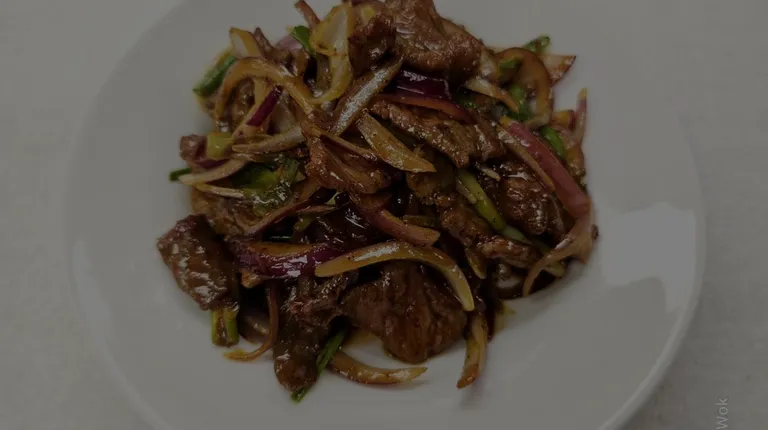 Brown sauce. Onions and peppers. Stir-fried with aromatic cumin seasoning; known for its bold and fragrant flavors