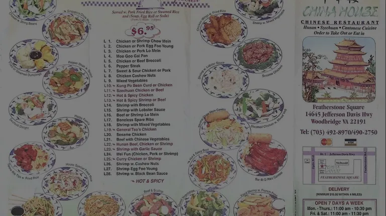 Best Chinese food in Woodbridge, VA. I've been ordering from here for over 20 years with no problems. I live in Dumfries now but I rather drive to this location. The Chinese cuisine close to me just doesn't cut it like China House in the feather stone plaza by Food Lion. My favorite is their chicken wings, steamed dumplings, and shrimp w/ broccoli. Older building but the food speaks for itself. Family owned and quality.
