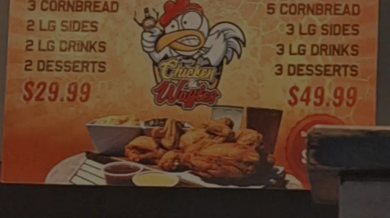 The food overall was good. Service , you order and get your own food , seat yourself & take care of yourself. Their lemonade was absolutely AMAZING. Waffle , was bland need to add something to the batter The chicken was good but wings were smallChicken tenders were seasoned better than the wings and were cooked PERFECTLY . Location , decent , they stayed pretty busy the entire time we were there. Overall, I'd come back we were in town visiting & found the place on a whim. Better than fast food.The overall appearance of the inside of the restaurant was nice , worn on the seats but I could care less as long at my food was good which it was.