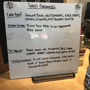 Delicious empanadas! I've had the Tio Shawn, Speedy Gonzalez, El Greco. Tio Shawn is the black bean and rice, Speedy Gonzalez is 4 different types of cheese, and El Greco is spinach and cheese. They are all very good - the El Greco is my favorite! Both the food truck and Union Market have awesome empanadas - they melt right into your mouth. Service is also very fast - the empanadas take 3 minutes to cook and only $3, not a bad deal!