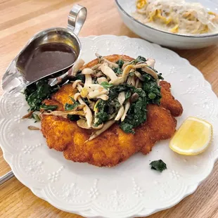 Came here for dinner recently on a Wednesday night--the restaurant is fairly new so it wasn't crowded, but we had reservations. Cute decor inside! Service was GREAT--food came out fairly quick and our server was friendly and attentive.For starters, the Fried Honey Old Bay Duck Wings was delicious. Loved the Chicken Caesar Lettuce Bouquets, which was uniquely presented. For pasta, the Bucatini Cacio e Pepe was AMAZING--well flavored and probably the best cacio e pepe pasta dish I've ever had (and I've been to Italy!!!) The Pork Schnitzel was good--it was well-fried and tender inside, but was not a huge fan of the sauce, had a bitter aftertaste. The Forest Mushroom & Truffle Pizza was huge portion with lots of topping, but the overall taste lacked flavor. For desserts, we enjoyed the Black & White Brownie (with ice cream) and Lemon Meringue Pie. Cocktails were super tasty--I enjoyed the Fairwind (gin based) and Cucumber Martini.Overall, food and service was good (with some minor improvements)--I will be back to try other dishes!