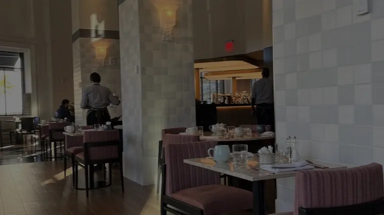 This restaurant is located in the lobby of Hotel Washington. When you check in, you're given two 15.00 vouchers. I went down to breakfast (because I had the vouchers, of course) and was pleasantly surprised. I ordered the omelette, which included a side and home fries. The home fries were a little too crispy but the omelette was huge and delicious. The coffee is excellent. The bill will include a 20 percent gratuity. The total for a breakfast for 1 was 34.00 after the coupon and tax I believe the bill was under 20.00.All and all not a bad deal for a hearty breakfast.