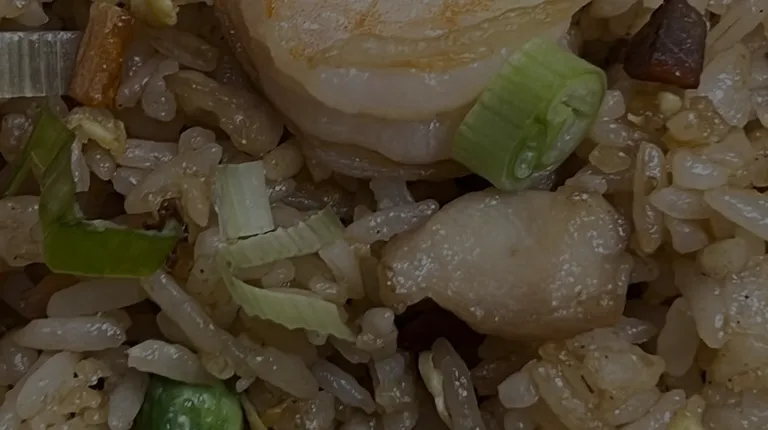 Combination fried rice with shrimp, chicken, pork, spring onion, peas, carrot.