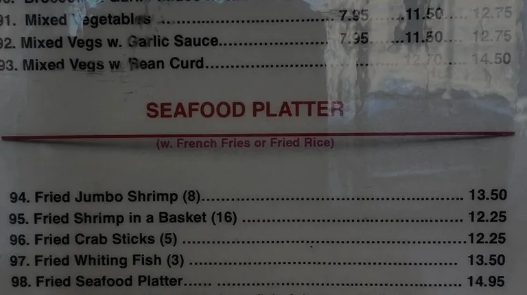 It's about time to stop supporting the Chinese community! They are over priced! This specific carry out is has charged me the same menu price for a platter ands I only preferred just shrimp! 8 jump shrimp for 13.50 with no rice or French fries is ridiculous!