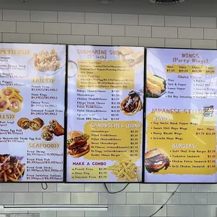 They have more than just subs and wings. They have tonkatsu burgers, soft shell crab burgers, egg rolls, sandwiches, and other things. Check out my menu photos. My wife and I tried their chicken wings and sub combos. We got the following:1) Japanese style fried chicken wings with honey wasabi sauce. There is a choice of 6 or 10 wings. They were not whole wings. They were drumettes and wingettes. They had panko bread crumb coating, which made them crispy, crunchy, and not oily. The meat was tender and moist with a savory flavor. The chicken was great! The honey wasabi sauce was hot and mildly sweet. It didn't have much honey flavor, and it didn't complement the chicken. I won't be getting this sauce again.2) Japanese style soy garlic black pepper wings. This was slightly spicy with a crispy crunchy panko coating. The chicken and breading were great! The sauce was just soy sauce. It was too salty! No garlic flavor was noticeable.3) Ribeye steak and cheese sub and a Ribeye steak and cheese sub with green peppers and mushrooms. They were combos, which means that fries and a drink are included. I substituted fried onion rings for one of the fries at an extra charge of 75 cents. The steak was chopped and thin sliced. The flavor was savory. The subs had plenty of steak. They were moist and tender when eaten fresh-made. Everything was cooked well and tasted very good! Eating leftovers the next day, the steak became somewhat dry, and the bread became soggy. Not good as a leftover! The fries and onion rings were okay tasting but not special. They lost their crispness quickly after closing the containers they were in. The drinks were canned Coke and Pepsi products. The service was helpful and polite. The eatery, dining room, and restrooms were clean. There's plenty of seating because they are in a food court. They are located in Restaurant Row Apollo shopping center, which is in an upper middle class area. The parking is free and plentiful. Based on our experience, their food is good and fairly priced. They're worth a visit if you're in the area.