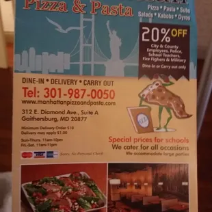 It has taken me 3 enjoyable meals to settle down to write this reveiw. Two were delivered meals and the third and most recent was a visit to the restaurant because I was curious about where these meals came out of. I had not intended to sit in but decided to when I saw the large space. I was pleased with the meals but wish they served water at the tables, wiped down their tables more frequently and had a waiter available for any needs seated patrons might have after they'd ordered their meals on entering the restaurant. The tables were not filthy but those few crumbs on the tables were tell tale. The first two meals I had from this restaurant were Gyro on Pita bread - authentic tasting sandwiches with the gyro meat more in planks than the smaller shavings I am accustomed to from other restaurants. My most recent meal from Manhattan Pizza & Pasta was the Souvlaki Dinner Delight which comprised of seasoned beef, a small Greek salad, pita bread, tzatziki sauce, frenchfries, ketchup and dressing for the salad. The meat in the Souvlaki Dinner Delight was well seasoned and flavorful although a bit chewy. The frenchfries were nice and crispy on the outside and soft on the inside; not greasy at all. The salad was excellent; fresh and crisp lettuce, tomatoes, purple onions, a pepper, an olive or two sprinkled with feta cheese. The pita bread was soft and a pliable. The tzatziki sauce was good; definitely acceptable by most standards. I love feta cheese and wish there was more with the meal. It was good to find food that was tasty and consistently NOT oversalted. The meal could feed two. I did bring the rest of my food home.The salad dressing (vinaigrette) was confusing. It was an awful lot of oil with seasoning...lurking at the bottom that did not yield when stirred. I did not use the vinaigrette. This is definitely something for the resaturant to consider doing something about.Whatever the shortcomings of this restaurant, the location, portions, and overall quality of the food made up for it. Good food, competitive pricing, and somewhere to sit if you choose to do so. In good weather you can cross the street to the Gaithersburg Community Museum and enjoy more of Gaithersburg Old Town.