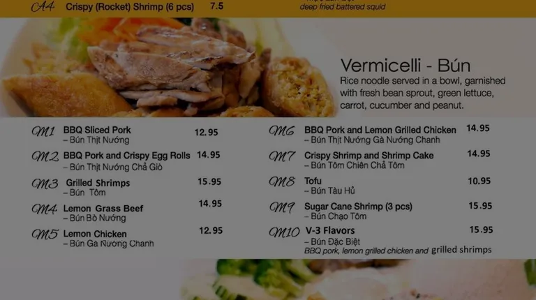 This place has become one of my favorite Vietnamese restaurants. I highly recommend the M10 with 3 flavors vermicelli. They go well with sauces, vegetables, or meat, making them a great choice for a quick and filling meal. It was amazing! The food comes out quickly, which is great! 10 out of 10.
