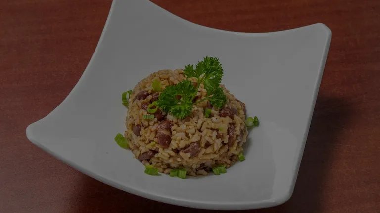 Grilled chicken skewers seasoned with a blend of traditional West African spices, served with spicy peanut sauce and a fresh salad of onions, tomatoes, and cucumbers.