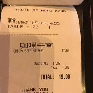 We always stop by Taste of Hong Kong for quick Cantonese food whenever we are up in Northern Virginia. Typically, we eat there for dine in, but we picked up an order of white cut chicken and salt and pepper pork chops; however, the food was a little colder than usual - granted we did pick it up 30 minutes after we placed the to-go order. The pork chops were quite overcooked - though the flavor was still good in my opinion. Regardless, heated up - the food was not bad. All together, the food came out to be $38 after tax. The only qualm we had was that there was only one white rice that came with these two orders (I believe the chicken does not come with a side of rice).