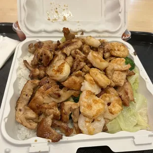 We were hungry and looking for something different for dinner on the fly. So being people who love hibachi we went ahead and tried this place. The staff was very friendly. They must be pretty popular because after we ordered the line got really long.I went with the beef and shrimp teriyaki plate and the BF got beef and chicken. Sadly there were only a few shrimp but there was lots of beef to make up for it. I usually get white rice at this style restaurant, but this time I tried the fried. It was OK, but I think white rice would be better. The sauce tasted more like regular brown gravy over the entree. Still it was a decent quick meal.