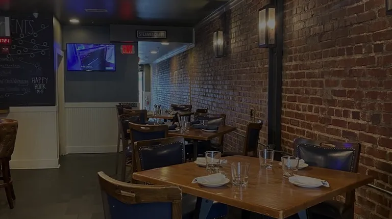 a dining room with a brick wall