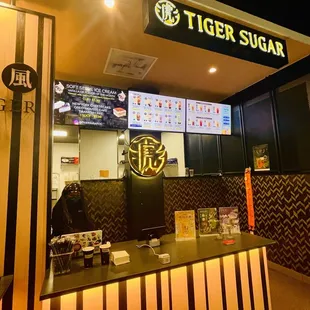 Okay so this place is located in a food hall with other eateries nearby. I came in craving a bubble tea and was excited about the menu options. I opted for the signature tiger, which is a black sugar boba milk with pearls and cream mousse. Overall it tasted good and satisfied my craving but I wasn't a fan of the actual boba pearls. Something was off about the size and texture that I'm used to. They were smaller and softer than other bubble teas I've had and the pearls weren't very sweet. If I come back I won't order pearls in my drink. My husband liked his drink the Green Tea Latte Brown Sugar Boba Cream Mousse. It was not overly sweet but he had the same issue with the pearls.