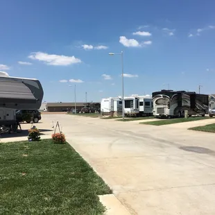 Honestly this park would have been a five star the only bummer was the hook ups for the person next door went trough the middle of the yard so the kids/dogs didn't have much grass space. We loved the beautiful paved lots tho my kids really enjoyed chalk 4 square riding bikes skateboards and scooters! It is well lit up and feels very safe even in the heart of Wichita! It's close to just about everything it's clean and very well maintained. I have picky kids and they even enjoyed using the shower rooms! Staff (and others) was(were) friendly and helpful and we really enjoyed our stay! Flat pull through cement lots, easy in easy out. If you have kids check out the exploration place! Oh last thing if you hear a huge bang in the middle of the night (1:45 am!!!) it's just the dumpster being emptied it about stopped my heart!We stayed 2 weeks family of 5- 3 young kids 2 big dogs and a kitty :)