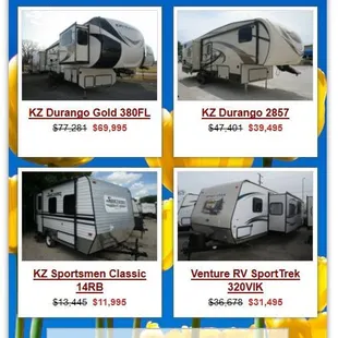 See our huge selection of Venture and KZ RVs! We offer new and used fifth wheels, toy haulers and travel trailers...