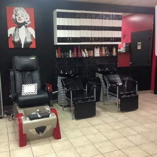 Classic decor, inspired by Marilyn Monroe (with a touch of classic car garage) and classy! Full service salon including heated foot baths for pedicures, fun music, and smiling technicians. Jenna is great! She's got a great eye!