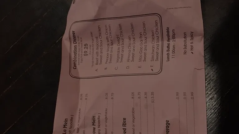 For a super small town this place definitely offers some very good food. There wasn't too many things to choose from but all the dishes that are most commonly ordered. The sweet and sour chicken meal can feed two but you'd have to order extra rice as they're a bit small of a side. They're super quick and the employees are really nice. The buffet they run is small and has the most common food ordered as well.