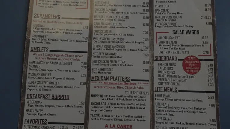 My family and I go here often, the food is always good and staff is always friendly. Dishes I've tried that are good are Chicken Fried Chicken, grilled cheese and waffle fries, cheese enchiladas, popcorn shrimp, bacon cheeseburger, French toast, pancakes, all their omelets...and salad bar really good too.