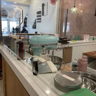 Tea, water, cortado with oat milk on custom-made, mosaic tile table