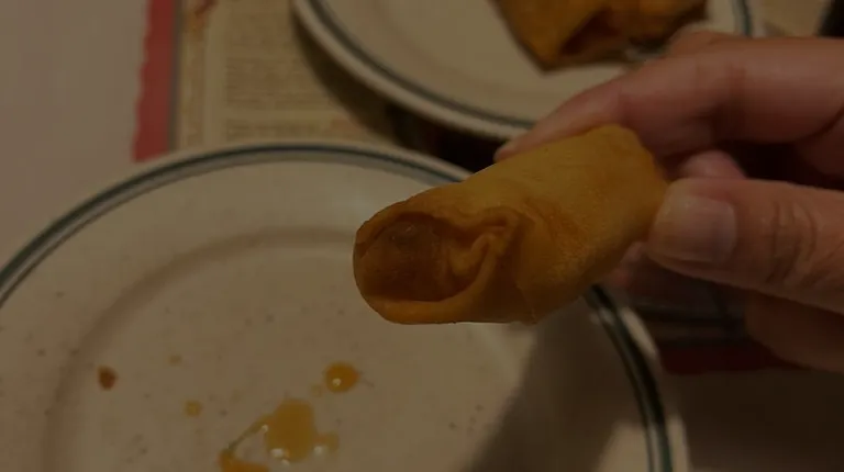 The spring roll - vegetable seeming filling in a vague white garlic sauce