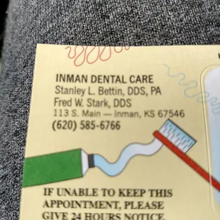 While staying at the Inman RV park I had a bad tooth. I seen a little dentist office down town. I go in and the office is old, no bells and whistles here. I'm waiting for the recipient's to get off the phone, thinking, "I'm not getting myself in to a nightmare ! " When she got off the phone the receptionist was very friendly. They made an appointment the next day. The dentist was absolutely wonderful. The shot was painless. When he used the drill no pain at all. Very caring , kind dentist. The staff was very friendly. I highly recommend this dentist office in Inman Kansas. I'm going back !!!