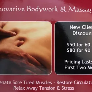 I have gone to innovative bodywork &massage since they opened and I have always been completely satisfied with the service I have always received.