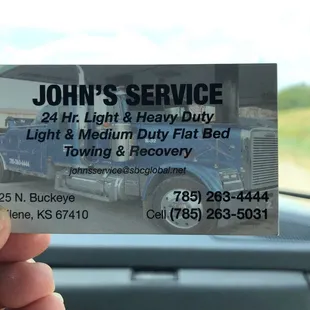 Absolutely couldn't ask for more from this company. My daughter's car broke down in Abilene, KS and they responded within 15 minutes to deliver it to Wichita at reasonable price. John is the man, and I wish all the beat to him and his company, he was so accommodating, I just hope anyone using a tow service calls them first. They won't be disappointed. Thanks John and the crew!!!!