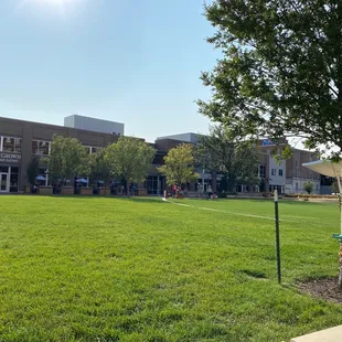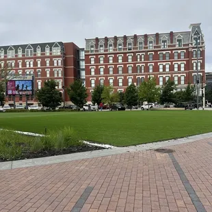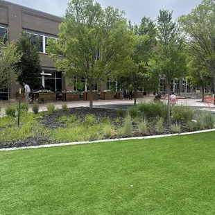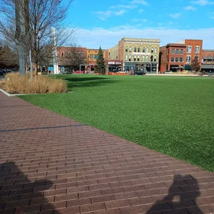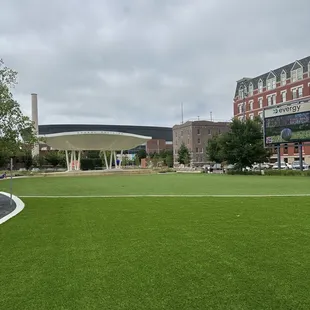 It was a decent open space in the city with lush AstroTurf. People were walking through and sitting around, eating meals, and relaxing. It was just a quick stop for us to let the dog walk a bit, but there are plenty of businesses nearby and an event center. There wasn't a playground or bathroom, but there was a stage for concerts.